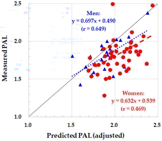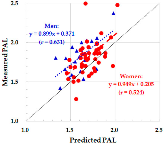 Relationship between measured and predicted PAL by the ASP without adjustment. Red closed circle and dotted regression line: women. Blue closed triangle and dotted regression line: men. Black dotted line: identity line.
