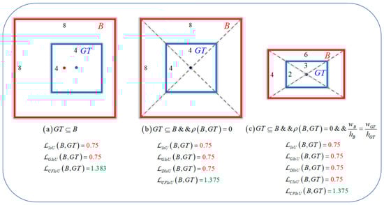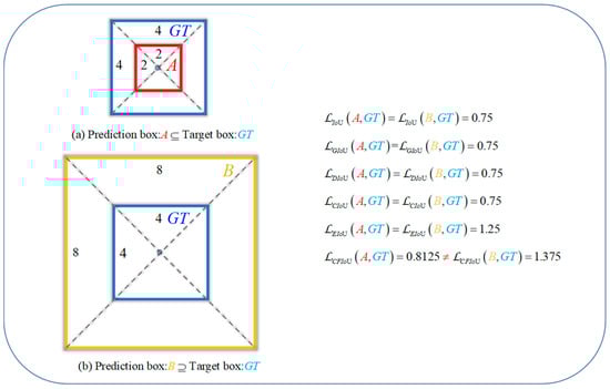 where and represent the center points of the predicted box and target box respectively. represents the Euclidean distance between the two points, and represents the diagonal distance of the minimum closed bounding box that contains both and . DIoU loss mitigates the slow convergence problem of GIoU loss to some extent. However, DIoU loss still cannot describe the overlap information between the two boxes well. Moreover, when the center points of the two boxes coincide completely, both GIoU and DIoU losses will still degenerate into IoU loss, as shown in Figure 1b.