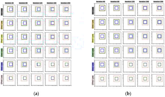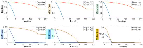(2) We conducted regression based on the predicted and target box positions in Figure 2a,b, using the BIoU and CFIoU losses as regression losses. We minimized the losses using gradient descent and obtained the final regression results after 200 iterations. Specifically, we visualized the process of minimizing various loss functions during the predicted box fitting to the target box in Figure 5. Through the visualization results in Figure 5, we found that for the two different regression results of the predicted boxes in Figure 2a,b, the BIoU loss values were equal: , , , , . This suggests that both the poorly and well-regressed predicted boxes received the same penalty, which caused the poorly regressed predicted boxes to lack additional gradient information to better or more quickly fit. In the IoU loss, GIoU loss, DIoU loss, and CIoU loss graphs in Figure 5, we found that the poorly regressed predicted box in Figure 2b could not fit the target box, while in the EIoU loss graph, although the poorly regressed predicted box in Figure 2b could eventually fit the target box, it did so much slower than the well-regressed predicted box in Figure 2a. In the CFIoU loss graph, the poorly regressed predicted box in Figure 2b and the well-regressed predicted box in Figure 2a received different penalties: . Clearly, the poorly regressed predicted box in Figure 2b received more penalties than the well-regressed predicted box in Figure 2a, which is due to the addition of information about the target foreground area in the CFIoU loss. From the CFIoU loss graph, it can be seen that the poorly regressed predicted box in Figure 2b achieved faster fitting speed (the losses of the predicted box and the target box started to converge after 40 iterations) while maintaining a good fitting effect.