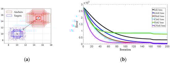 To validate the effectiveness of the CFIoU loss on a large number of anchor box regressions, we designed a simulation experiment using a synthetic dataset (Figure 6a) to simulate the regression of bounding boxes. By specifying a loss function , we can simulate the regression process of the bounding box under each situation using the gradient descent method. The current prediction for the predicted box after iterations can be obtained using Equation (14):