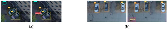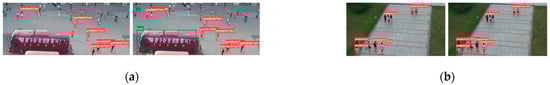 Detection examples using YOLOv5s trained on the VisDrone2019 dataset. Visualization samples are chosen from VisDrone2019-DET-test-challenge. (a,b): Left: , right: .