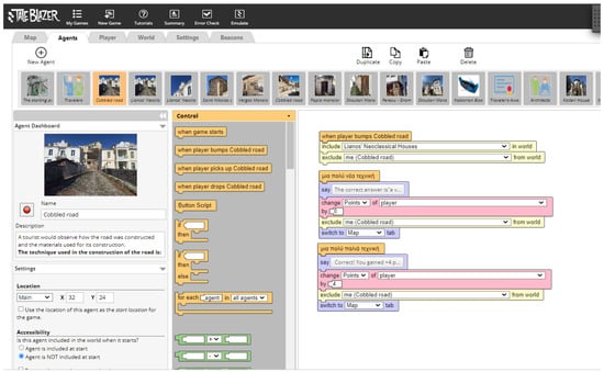 As mentioned, this initiative aimed to make an application that would inspire educators and provide them with ideas on transforming educational cultural heritage tours into AR experiences. Although most projects dealing with location-based AR utilize tools that require advanced programming knowledge, in our case, tools that are accessible and user-friendly to a broader audience were needed. In this category, there are tools that do not require programming (e.g., Metaverse Studio, Web AR, Action Bound) and tools that are suitable for novice programmers. Taleblazer is such a tool. TaleBlazer was developed by the “Scheller Teacher Education Program (STEP)” of the Massachusetts Institute of Technology (Massachusetts Institute of Technology, MIT). Taleblazer has a visual block-based programming environment similar to Scratch, another popular product of MIT (Figure 2).