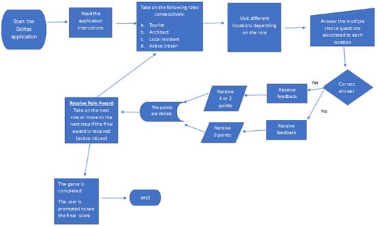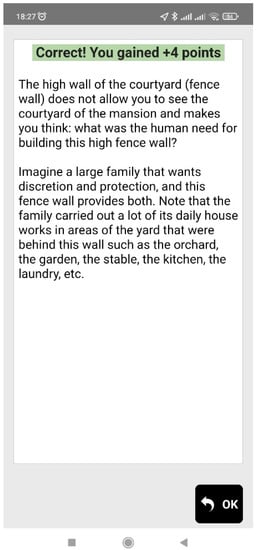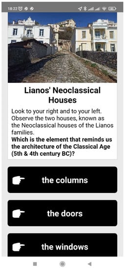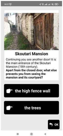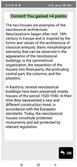 In the requirements analysis phase, specific considerations and decisions needed to be made, such as determining the application’s target audience and the software tools that would be used for implementing the application. In the application design phase, the user interface, the application scenario, and the game mechanics were designed. It was a design decision to introduce different roles, gamification elements (e.g., points, awards), and elements that would also keep the focus on the real world and the aspects of cultural heritage interest (questions that require the observation of the physical surroundings). Members of the research team determined the application content in close collaboration with the educators of the Center for Education for the Environment and Sustainability of Kastoria.