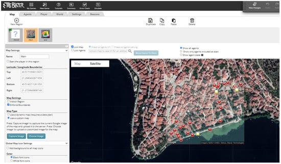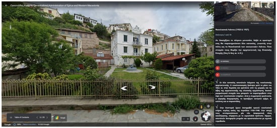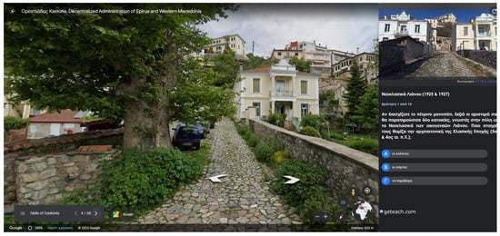 Furthermore, as mentioned in the previous sections, a Google Earth VR tour was also created in order to be used after the augmented reality experience (in class time or at home) to consolidate the acquired knowledge. The creation of this project has also gone through similar development stages as the AR application, contains the same locations and follows a similar scenario. HTML and Javascript libraries were also used to enhance the interactivity of the project. Details of the Google Earth VR tour are presented in Section 6.
