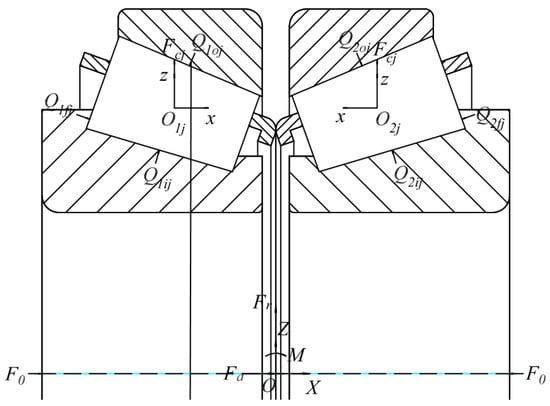 Assume that the bearing as a whole is subjected to a radial outward load Fr, axial outward load Fa, axial preload F0, and the external bending moment load M, taking into account the centrifugal force on the roller Fcj; the function is shown in Figure 1.