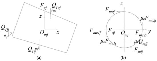 For a single tapered roller with asymmetric left and right sides, the stress relationship is shown in Figure 2. Qmoj, Qmij and Qmfj are the roller outer raceway contact load, roller inner raceway contact load, and roller big end rib contact load, respectively; Fmc1j and Fmc2j is the normal force between the roller and the cage pocket; μc and μf is the coefficient of friction between the roller pocket and the roller rib; and Fdj is the fluid resistance.