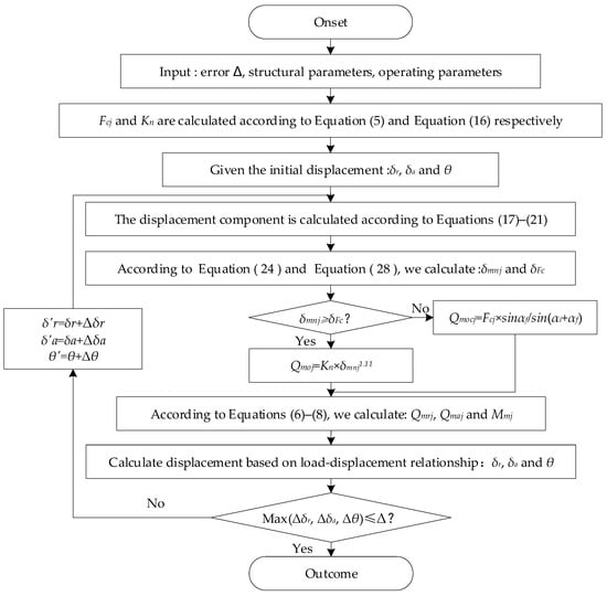 During the iteration process, taking the total contact deformation δmnj and minimum contact deformation δFc, the larger value of the two is used as the new total contact deformation amount. Set the iteration error Δ = 1 × 10−9 and calculate the deviation between the two iteration results before and after each iteration for Δδr, Δδa and Δθ until the maximum deviation is less than or equal to the set iteration error Δ, the iteration is completed and the result is given as an output. The specific calculation process is shown in Figure 5.