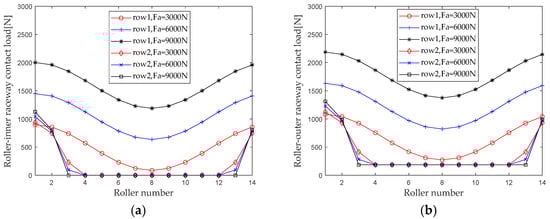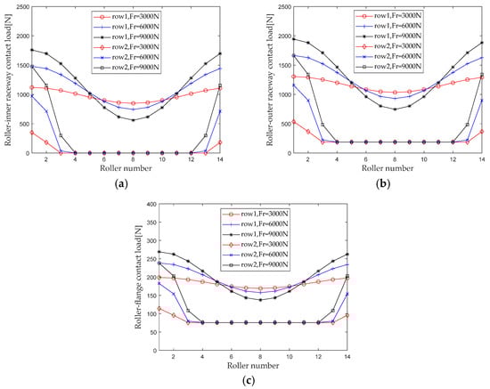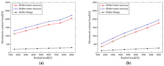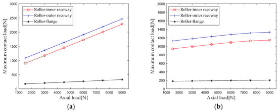 It can be seen that the maximum contact load at the roller outer raceway, roller inner raceway, and roller inner ring edge increases with the increase in radial load; as the radial load increases from 1500 N to 9000 N, the maximum contact loads at the first row of roller outer raceways, roller inner raceways, and roller inner ring ribs increased by 70.2% (916.2 N), 81.9% (916.2 N), and 50.6% (100.7 N), respectively. The maximum contact loads at the second row of roller outer raceways, roller inner raceways, and roller inner ring ribs increased by 261.6% (1402.5 N), 401.1% (1403.7 N), and 134.8% (154.2 N), respectively. The maximum contact load at the first row of rollers is greater than that at the second row, but the change amount and amplitude of the maximum contact load are less affected by the radial load than at the second row. This is mainly because the impact of the axial load is relatively weakened when the radial load is increased during composite loading.
