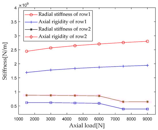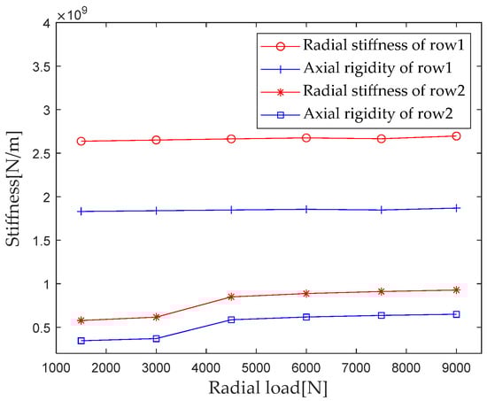As can be seen from the results in Figure 12, for the first column of the main load, the radial and axial stiffness components increase with the increase in the axial load, with the axial load increasing from 1500 N to 9000 N, and the radial and axial stiffness increasing by 14.3% and 14.9%, respectively. In the second column, as the axial load increases, the radial and axial stiffness components first slowly increase, then decrease, and then slowly increase. When the axial load increases from 6000 N to 7500 N, the contact area between the roller and raceway decreases, which is the main reason for the sudden decrease in stiffness.