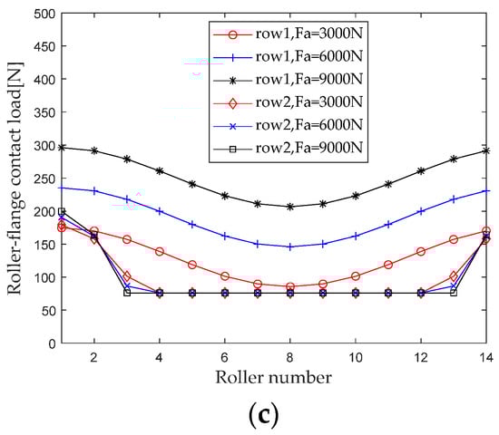 Axial load distribution. (a) Roller-inner raceway; (b) Roller-outer raceway; (c) Roller-flange.
