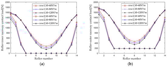 When studying the effect of bending moment load on the internal load distribution of bearings, maintain the rotational speed, radial load, and preload, and keep the axial load unchanged (ωc = 1200 r/min, Fr = 8000 N, F0 = 100 N, Fa = 3000 N); the bending moment M gradually increased from 40 N×m to 120 N×m (with an interval of 40 N×m). First calculate the contact loads at various locations inside the double-row tapered roller bearing under each group of operating conditions. Figure 13 shows the load distribution.
