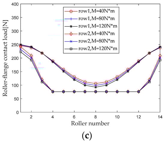 Bending moment load distribution. (a) Roller-inner raceway; (b) Roller-outer raceway; (c) Roller-flange.