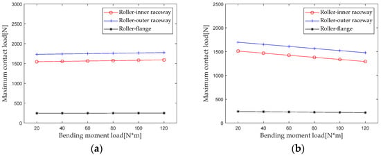 The maximum contact loads of the roller-outer raceway, roller-inner raceway and roller-rib under different axial loads are extracted for analysis. The results are shown in Figure 14. It can be seen that the influence of the bending moment on the maximum contact load of the first and second rows of rollers has an opposite trend. The maximum contact load at the roller outer raceway, roller inner raceway, and roller inner ring edge of the first row of rollers increases with the increase in the bending moment, while the maximum contact load of the second row decreases with the increase in the bending moment. When the bending moment increases from 20 N*m to 120 N*m, the maximum contact load at the first row of the roller inner raceway, roller outer raceway, and roller rib increases by 2.6% (44.7 N), 2.9% (44.6 N), and 2.0% (4.9 N), and the maximum contact load at the second row of roller inner raceway, roller outer raceway, and roller rib decreases by 14.5% (−219.3 N), 12.9% (−219.1 N), and 9.9% (−24.1 N), respectively. The maximum contact load at the second row of rollers is more affected by the change in the bending moment than the first row of rollers.