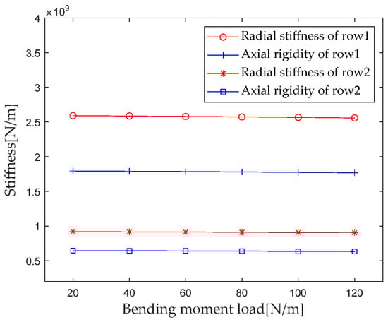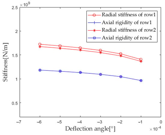 According to Section 2.4 Contact Stiffness, the parameters such as bearing structure, material properties, and contact load are brought into the calculation equation. When the deflection angle gradually increases from −0.0001° to −0.0006° (with an interval of −0.0001°), the first column radial stiffness, the first column axial stiffness, the second column radial stiffness, and the second column axial stiffness are calculated and analyzed. The results are shown in Figure 24.