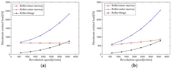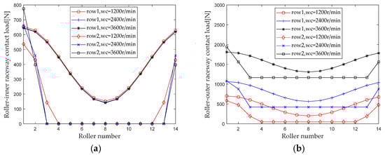 As can be seen from Figure 16, when the rotational speed increases, the contact loads of the roller outer raceway and the roller rib at each roller show an increasing trend due to the centrifugal force, while the contact loads of the roller inner raceway slightly decrease.