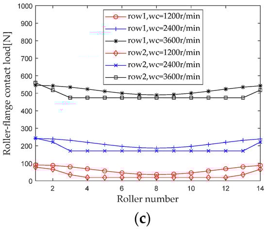 Speed load distribution. (a) Roller-inner raceway; (b) Roller-outer raceway; (c) Roller-flange.