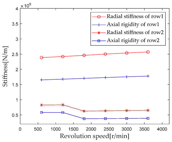 According to Section 2.4 Contact Stiffness, parameters such as bearing structure, material properties, and contact load are brought into the calculation equation to calculate the rotational speed ωc when gradually increasing from 1200 r/min to 3600 r/min (with an interval of 600 r/min). The first column radial stiffness, the first column axial stiffness, the second column radial stiffness, and the second column axial stiffness are analyzed, and the results are shown in Figure 18.