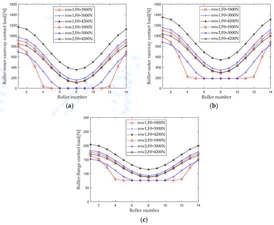 Preload load distribution. (a) Roller-inner raceway; (b) Roller-outer raceway; (c) Roller-flange.