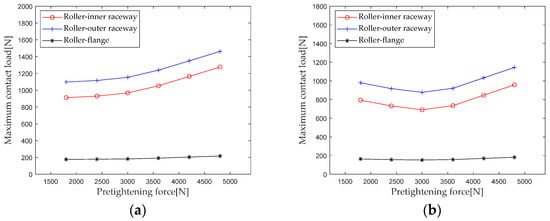 Effect of pretightening force on maximum contact load. (a) row 1; (b) row 2.
