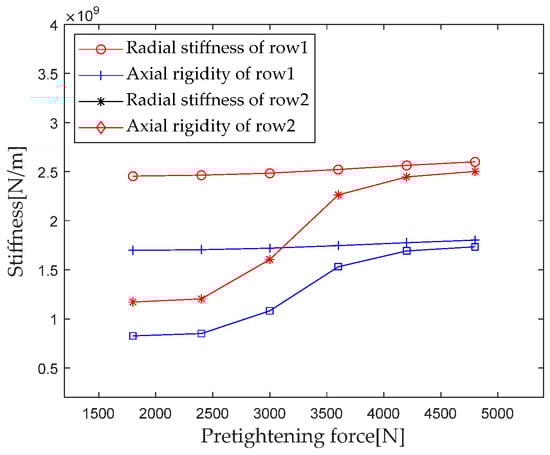 According to Section 2.4, the parameters such as bearing structure, material properties, and contact load are brought into the calculation equation. When the preload gradually increases from 1800 N to 4200 N (with an interval of 600 N), the first column radial stiffness, the first column axial stiffness, the second column radial stiffness, and the second column axial stiffness are calculated and analyzed. The results are shown in Figure 21.