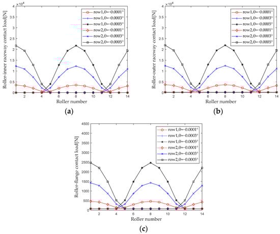 Deflection angle load distribution. (a) Roller-inner raceway; (b) Roller-outer raceway; (c) Roller-flange.
