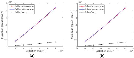 Effect of deflection angle on maximum contact load. (a) row 1; (b) row 2.