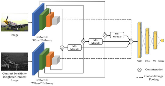 First, inspired by the ventral and dorsal pathways of the HVS, a dual-stream convolutional neural network is proposed, with the two streams named the “what” pathway and the “where” pathway, respectively. The “what” pathway extracts the content features of distorted images, while the “where” pathway extracts the global shape features. The features of the two streams are fused and mapped into an image quality score.