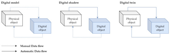 The digital twin concept in manufacturing was examined from a categorical perspective by [16]. The author proposed three subcategories of digital twin based on data-integration levels to clarify the level of digital twin integration in existing studies. To define the depth of integration of the digital twins in existing studies, the author proposed three subcategories of digital twins based on data-integration levels: digital model, digital shadow, and digital twin. We can see all three categories in Figure 1.