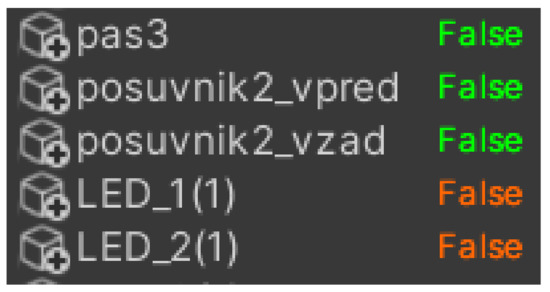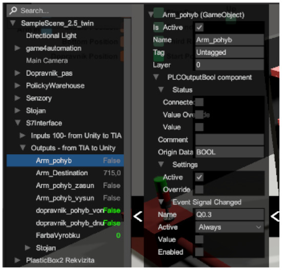 We created a build application in the Unity editor environment (Figure 35). In the main window of the simulation we can connect to the connected PLC device via the Connection icon. If the connection is enabled and functional, the conveyor and the conveyor simulation model will react to signals bilaterally. We can control the real conveyor belt using the signals in the simulation and vice versa. However, we can control the simulation without being connected to a PLC device. We have buttons available for manual control of the conveyor belt, stacker arm, and rack. The button to create a new carrier with a workpiece is used when simulating the stacking of multiple carriers in the warehouse. When the simulation begins, we make sure that the workpiece carrier is ready on the conveyor belt. If the carrier is there, we can start the stacking simulation using the move conveyor belt forward button. When the carrier with the workpiece arrives at the second signal on the conveyor belt, the stacker arm starts to perform the automatic simulation. The user can follow the simulation and can edit objects and signals directly during the simulation. On the left side of the screen, we click the arrow that contains the hierarchy of objects used in the scene. There is also an S7 interface with the signals used. These signals we can set or toggle their state, or we can deactivate them. The add-on improves troubleshooting and makes it easier to simulate different scenarios. Figure 36 shows the output signals and their states directly in the running simulation.