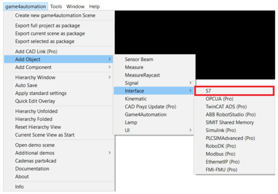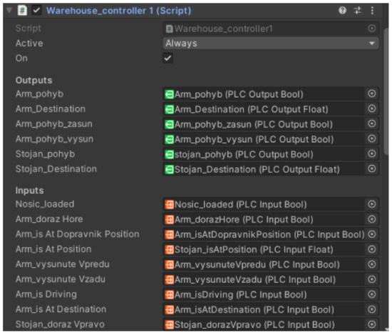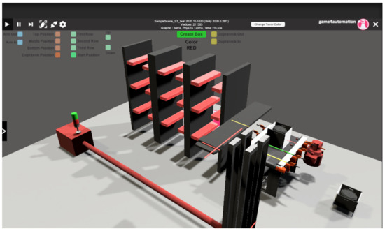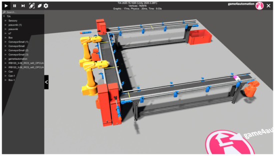 The original solution to our problem was to try a Node-Red middleware to link the hardware and software and work with the data that the line sends, then we would have to store, process and overwrite those data every time there was a change on the physical line. Since this procedure seemed complicated, we decided to look for other solutions. While looking for our options, we discovered the Game4Automation framework, which is available directly in the Unity Asset Store and is therefore fully compatible with Unity. This type of programme solves all the problems related to the individual interfaces between hardware and software, and also solves the visualisation of the digital twin thanks to a library of models. Basic components include conveyor belts, sensors, or goods. However, the framework also offers an extended downloadable library directly in the Unity Asset Store, which contains components from various companies. Each version of the framework is paid for. We worked with the basic and therefore cheapest version. This version provides connectivity to all types of PLC hardware by Siemens (S7-300, S7-400, S7-1200, S7-1500). Communication is provided by the S7 TCP-IP protocol, but higher versions also offer other types, such as OPC UA or Modbus. The S7 TCP-IP interface is based on Snap7 Ethernet communication. This is used for Ethernet communication with PLC systems [58]. To give even a beginner an idea of how the individual components work, the framework offers simulated scenes where these components are used. Of course, if the basic functions are not enough for someone, the framework provides the possibility of reprogramming the scripts.