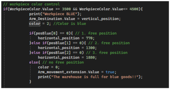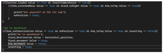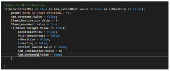 The condition for returning the stacker to the initial position must be met. This process is triggered by the auxiliary variable “backToStartPos”, which checks the state of the stacker. The arm is not extended to the front and the stacker is not yet at the starting position. When the process starts, the horizontal position is set to 0 and the rack and arm is set in motion. When the rack arrives at the selected position, the auxiliary variables are reset and the entire stacking process can be restarted. At this point, a new workpiece carrier can be added to the conveyor belt and the stacking system will work automatically, according to the warehouse status acquired so far (Figure 34).