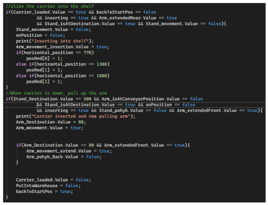 We divide the process of stacking the carrier in a free position in the warehouse into two parts. The first step is to retract the carrier arm. The arm is retracted and stops only at the pressed switch, which indicates that the arm is maximally retracted (in this case in the warehouse). The moment the arm is retracted, the occupied position is also recorded, in a specific field position according to the colour of the workpiece. The second step in the process is to pull the stacker arm out correctly. According to the table with the vertical coordinates, we know to what specific value the arm must be lowered and then extended to the base position. The second condition of the process checks both the input and output signals. If the model is in the correct state, a vertical movement of the arm is performed so that the carrier is put in position and then the arm is returned to the initial position. At the end of the process, the particular auxiliary variables are set to FALSE and a new process is started. This new process—return to the starting position, is triggered by the variable ‘backToStartPos’, which is set set to TRUE Figure 33).
