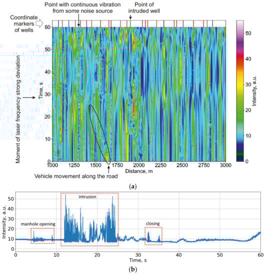 The scheme of the phi-OTDR used in our experimental studies is shown in Figure 1. The sensor part was realized based on cables that were part of the urban fiber-optic infrastructure, with the ability to access them through communication wells. During experiments, these wells were intruded, and the corresponding phi-OTDR signals were collected. Based on the analysis of these signals, algorithms for intrusion detection and disturbance types’ determination were designed. An example of the reflectogram obtained from the experiment as well as a measured waterfall are shown, respectively, in Figure 2a,b.