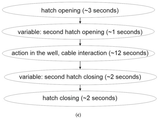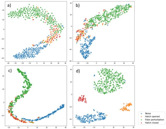 It can be seen that the most distinguishable event classes are shown in Figure 6d. These results are quite consistent with the quality of the constructed models. It is worth noting that a large number of events, such as “taking off a manhole” and “putting down a manhole”, lie together. This observation is very intuitive because similar manipulations are actually performed in the two cases and should create interference of a similar nature. In all four cases, events of the types “noise” and “operations in the well” are best separated. This property will be useful in practice since one of the main tasks of the algorithm is to determine the intrusion and violation of the cable state.