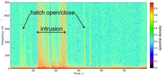 Each telecommunication well had one heavy metal cover and an average depth of 1 to 4 m. In order to carry out the descent into the well, a portable ladder was used. In practice, the use of such equipment inevitably leads to direct interaction with the equipment and cables inside. Moreover, due to the large number of cables in a small space, it practically does not matter which of them will be affected: the fiber-optic sensor cable or the neighboring copper one. In any case, the signal will be of high intensity due to the contact between the cables. The frequency of the disturbance impact may vary depending on human actions, but in intensity phi-OTDR, this frequency can usually be observed in the entire recorded range up to 500 Hz. An example is shown on the spectrogram in Figure 3.