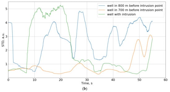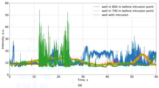 The main difficulties in analyzing incoming signals are now highlighted. Firstly, the urban infrastructure creates a lot of noise. Well covers are often located on footpaths or roadways, thus collecting many different vibrations even under normal operating conditions. The effects of a person’s steps on the well, or the passage of transport, can be easily confused with the opening process. A lot of traffic can be detected as an impact on the cable. Secondly, noise also appears due to the instability of the system components (the noise of the optical preamplifier and the laser frequency drift). The first component has an approximately constant level if measured in short-term sections. However, the second component may manifest itself in different ways, unlike the result of random interference. If it generates the minimum interference, the sensitivity in this area will be minimal, and the signal amplitude will change little even with strong disturbance exposure. When reaching the interference maximum, even in the absence of exposure, the signal fluctuations will have a large amplitude, and this can be taken as an intrusion in the well. Examples are shown in Figure 4a. All the signals have noise because of the instability of the system components. Nevertheless, their general behavior can be considered. A signal from the fiber near the well-being disturbed by the intrusion is shown in green, containing a slowly varying component when there is no intrusion. When the well is disturbed, sharp and intense signal variations appear between 10 and 15 s, so the intrusion can be detected. The orange curve demonstrates a good example of a signal without intrusions, as it is calm and changes slightly. A blue one relates to a well located 800 m before the intrusion point. Despite the fact that this well is only affected by environmental and system noise without intrusions, the signal can be confused to contain information about someone operating with the well.