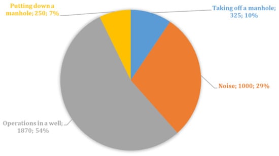 Further, time dependencies were taken from the selected waterfall sections. Three types of events were manually marked on them: the opening of the hatch, the action in the well, and the closing of the hatch. An array of intensity values for 5 s was assigned to each event. We called such an array an object. To increase the sample size of the data, we also took data from the two previous and two following coordinate points. This makes it possible to partially compensate for the low sensitivity of the sensor in the case of the interference minima described above or to process a stage with a lower noise level in the case of a maximum. In addition, from sensor coordinates located outside the well area, objects were selected as the noise samples. This choice allowed for additional options for the noise environment created by the urban infrastructure and the completeness of all signs of interference. In total, the study included a sample of 3445 different objects. The distribution of events in the resulting sample can be seen in Figure 5. The dataset was divided into training and test parts in a ratio of 4:1. The selection of hyperparameters was carried out based on cross-validation of the training sample at 𝑘 = 5. As the main criterion for the quality of the algorithm, we consider the proportion of correct answers—accuracy.