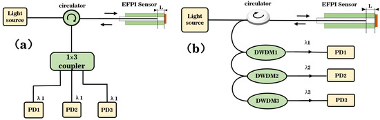 The traditional three-wavelength symmetric demodulation method, based on the coupler EFPI fiber acoustic sensor system block diagram, is depicted in Figure 2a. The light emitted from the light source passes through the circulator and enters the EFPI fiber acoustic sensor for double-beam interference. The reflected light from the sensor carries the external detection signal and returns to the circulator, where it is divided into three beams by the coupler. Using the inherent characteristics of the coupler, the coupler outputs three beams of light with the same central wavelength, a light intensity ratio of 1:1:1, and a phase difference of 2/3 between adjacent light paths. The detector then performs photodetector (PD) conversion on the three beams of interference light, and subsequently employs the principle of symmetric demodulation for phase demodulation of the three signals.