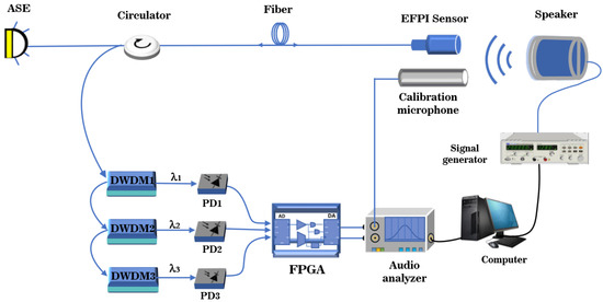 In order to validate the effectiveness and practicality of the combined use of WDM technology and the principle of symmetric demodulation method, an optical path and circuit are designed to construct a demodulation system for fiber optic EFPI acoustic sensors based on the optical path structure depicted in Figure 2b, as illustrated in Figure 3. An amplified spontaneous emission (ASE) source with a wavelength range of 1493 to 1593 nm and a power of 50 mW is connected to a circulator (CIR-3-1550-A-025-200ZC), and the output of the circulator is connected to an EFPI fiber optic acoustic sensor. The EFPI sensor has a FSR of 12.188 nm and an interferometric contrast of 0.992. The reflected light from the EFPI sensor is directed into a three-channel DWDM system (DWDM-200G-C33-250-1-NE, DWDM-200G-C38-250-1-NE, DWDM-200G-C28-250-1- NE ) with a channel bandwidth of 200 G, which creates three interferometric signals with center wavelengths of 1546.92 nm, 1550.92 nm, and 1554.94 nm. These signals are then converted to voltage signals by three PD (PD1, PD2, and PD3) with a response of 0.85 A/W. The output voltage signals from the PD are collected by an ADC (AD7606) at a sampling frequency of 178 kHz. The real-time data captured by the ADC are transmitted through the Inter-Integrated Circuit (I2C) protocol to the field-programmable gate array (FPGA) core board (ZYNQ-7020), which demodulates the phase information of the three signals. The output of the demodulation is sent through the Serial Peripheral Interface (SPI) protocol to the digital-to-analog converter (DAC) (PCM5102), which transforms the digital audio stream into an analog audio signal.
