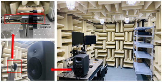 The audio metrics test system utilizes a computer-controlled signal generator (ABTEC-PA01) to generate different signal frequencies and amplitudes, which are then used to drive the speaker (ABTEC-AX-MC01) to generate sound as the audio source. The analog audio signals from the calibration microphone and the fiber optic EFPI acoustic sensor demodulation systems are received by the audio analyzer (ABTEC-A2) to demodulate various audio qualities, such as signal integrity, SNR, frequency domain response, linearity, sensitivity, etc. To ensure the authenticity of the experimental data, the FP cavity probe, calibration microphone, and audio source are placed in an anechoic chamber to minimize the influence of external interference. The experimental setup in the anechoic chamber is shown in Figure 6, where the FP cavity probe and calibration microphone (HS6020) are positioned at the same distance and on the same horizontal plane as the speaker, allowing for simultaneous reception of the sinusoidal signal generated by the speaker.