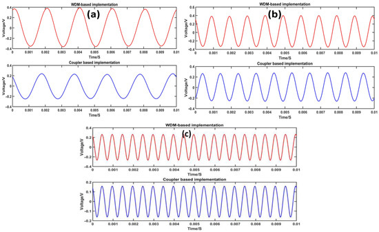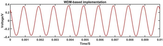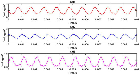 From Figure 7, it can be observed that the magnitudes of the DC components of the voltage signals from the three channels before ADC acquisition are inconsistent. This inconsistency may be attributed to the varying optical intensities of the three channels due to the optical path losses introduced by the use of DWDM. However, the subsequent algorithm normalizes the signals, thereby reducing the impact on the demodulation performance.