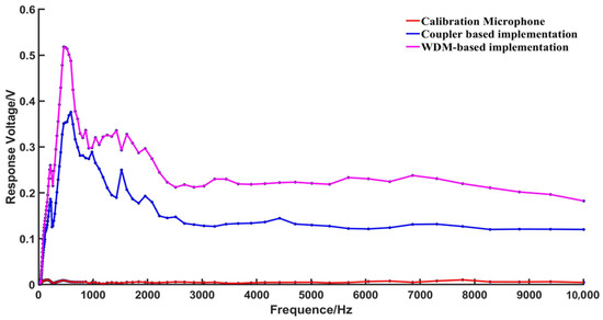 In order to investigate the specific reasons for the amplitude differences in the demodulated voltage values at different frequencies, the frequency response curve of the fiber optic EFPI acoustic sensor’s demodulation system was tested. A control signal generator generated sinusoidal signals with frequencies ranging from 20 Hz to 10 kHz, with test points selected at intervals of 50 Hz. The loudspeaker was driven with a voltage of 100 mV, and the demodulated voltage amplitude was recorded at each acoustic frequency. The frequency response of the fiber optic EFPI acoustic wave sensor’s demodulation system, employing two optical path structures, and the calibration microphone is shown in Figure 10.