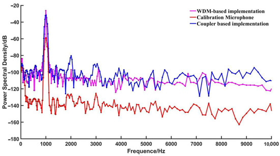 The demodulation system of the WDM-based fiber optic EFPI acoustic sensor exhibited a peak power of −28.4 dB at 1 kHz, with an average bottom noise power of −103.9 dB in the frequency range of 20 Hz to 10 kHz, resulting in an SNR of 75.5 dB. On the other hand, the calibration microphone showed a peak power of −60.1 dB at 1 kHz, with an average bottom noise power of −128.3 dB in the same frequency range, yielding an SNR of 68.2 dB. In comparison, the coupler-based fiber optic EFPI acoustic sensor demodulation system demonstrated a peak power of −32.8 dB at 1 kHz, with an average noise floor power of −97.9 dB and an SNR of 65.1 dB in the frequency range of 20 Hz to 10 kHz.