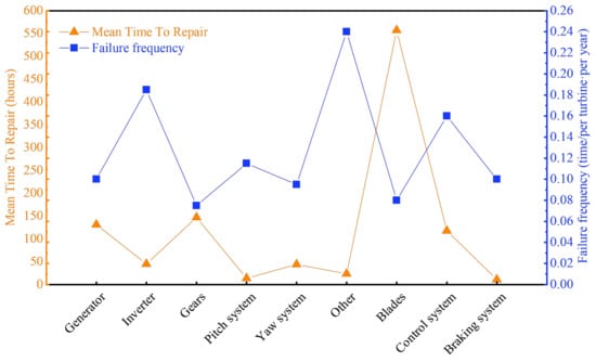 In recent years, global climate change has become a key issue for all of mankind. With the continued warming trend, environmental protection actions are imminent. Therefore, the development of clean energy is an important solution to cope with environmental changes. Wind power is favored by countries in all regions of the world because of its zero-carbon-emission advantage. According to the Global Wind Energy Council’s (GWEC) 2022 Global Wind Energy Report [1], wind power capacity is expected to reach 557 GW by 2026. With the rapid growth of installed wind power capacity, the wind power industry is facing various challenges. Wind turbine operation fault monitoring and maintenance technology have become key issues restricting the development of the wind power industry. Ribrant and Bertling [2] investigated the critical failures of wind turbines in Swedish wind farms and analyzed the percentage of failures and downtime of different components for maintenance. The China Renewable Energy Professional Committee investigated the operational quality of wind power and the frequency of failures, as well as the corresponding repair time (blue and orange dashed lines, respectively, in Figure 1), of wind turbine components derived from the survey data. As shown in Figure 1, blades are the components responsible for the highest frequency of wind turbine failures and associated with the longest repair time. Therefore, the development of wind turbine blade health detection technology has become an urgent need for the wind energy industry. In practice, wind turbines can only generate maximum power within a specific wind speed distribution range [3]. However, the actual wind speed will change, requiring timely and accurate regulation of wind turbines. To solve the problem of not always running in sync with factory mode due to quantization, time delays, and ubiquitous data dropouts, Cheng et al. [4] designed a Dissipativity-based finite-time asynchronous output feedback control for a wind turbine system via a hidden Markov model. A simulation example of a wind turbine system is used to verify the correctness and applicability of the controller.