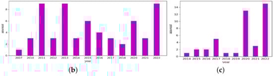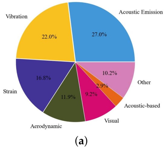 At present, the methods used for wind turbine blade health monitoring include acoustic emission, vibration detection, strain detection, aerodynamics, machine vision, thermal and sound-based features, etc. In this review, we analyze different damage detection techniques for wind turbine blades through a search of the Web of Science core collection. A search using the terms “wind turbine blade” AND “damage” yielded a total of 1410 articles. We performed an econometric analysis of the statistical data available to date using Python, as shown in Figure 2, indicating the relative prevalence of major blade damage detection techniques in the literature. This paper focuses on the application of AE damage detection and aerodynamic noise damage detection technology in wind turbine blades. Figure 2b is blade aerodynamic noise and Figure 2c show the research trends of non-destructive testing (NDT) techniques in recent years.