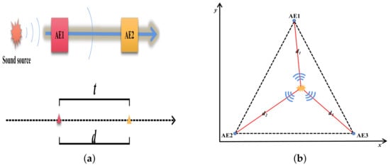 Acoustic emission source location. (a) Linear location of the AE source; (b) acoustic emission source plane location.