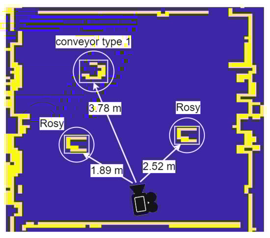 Examples of the OMR position and orientation are listed on the bottom of the frames in Figure 3. As a benefit of the IMU integration with Zed 2i, we can obtain the camera position, rotation, and quaternion orientation. In addition to the ZED 2i camera, the OMR is equipped with two LiDAR sensors for a 360-degree map. At this stage, the LiDAR data are empirically merged with the detected objects to obtain a bird’s-eye view map of the entire environment. In Figure 4, we can see the obtained map of the environment with the detected objects shown in Figure 3.