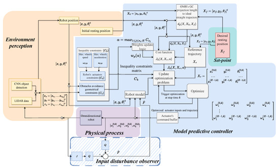 Independent of the type of path planning algorithm, the OMR structure is beneficial because it better resembles the material point model used for simplifying the modeling of robots in motion planning simulations. In [6,7,8,9], a four-wheel’s dynamic and kinematic modeling, OMR was studied using the Lagrange framework. Sliding mode control allows robust control for OMRs employing mecanum-wheels and rejects disturbances caused by unmodeled dynamics [10,11,12]. The nonholonomic model of the wheel was used to develop the dynamic equation of an OMR with four mecanum wheels [13]. The kinematic model of a three-wheeled mobile robot was used to create a predictive control model and filtered Smith predictor for steering the robot along predetermined paths [14]. A reduced dynamic model of the robot is the basis for developing a nonlinear model-predictive controller for trajectory tracking of a mecanum wheeled OMR [15]. A constrained quadratic programming problem is formulated towards optimizing the trajectory of a four-wheel omnidirectional robot [16]. Dynamic obstacles are considered in the work of the authors [17], whereas the numerical implementation presented in [18] is based on a three-wheeled omnidirectional robot. Distributed predictive control on a cooperative paradigm is discussed for a coalition of robots [19]. A nonlinear predictive control strategy with a self-rotating prediction horizon for OMR in uncertain environments is discussed. The appropriate prediction horizon was selected by incorporating the effects of moving velocity and road curvature on the system [20]. Adaptive model-predictive control, with friction compensation and incremental input constraints, is presented for an omnidirectional mobile robot [21]. Wrench equivalent optimality is used in a model-predictive control formulation to control a cable-driven robot [22]. Authors discuss an optimal controller to control the robot’s motion on a minimum energy trajectory [23]. Recently, potential field methods have been used mainly due to their naturally inspired logic. These methods are also widely used in omnidirectional mobile robots due to their simplicity and performance in obstacle avoidance [24,25]. Timed elastic-band approaches utilize a predictive control strategy to steer the robot in a dynamic environment to tackle real-time trajectory planning tasks [26]. Because the optimization is confined to local minima, the original timed elastic-band planner may cause a route through obstacles. Researchers proposed an improved strategy for producing alternate sub-optimal trajectory clusters based on unique topologies [27]. To overcome the mismatch problem between the optimization graph and grid-based map, the authors suggested an egocentric map representation for a timed elastic band in an unknown environment [28]. These path-planning methods are viable and pragmatic, and acquiring a desired path in various scenarios is generally possible. Yet, these approaches could have multiple drawbacks, such as a local minimum, a low convergence rate, a lack of robustness, substantial computation, and so on. Additionally, in logistic environments where OMR robots are equipped with conveyor belts to transport cargo, it is essential to guarantee low translational and rotational accelerations for the safety of the transported cargo. Therefore, we propose a nonlinear predictive control strategy on a reduced model where we can include maximum acceleration and velocities of the wheels within inequality constraints derived from the obstacle positions obtained from environment perception sensors (i.e., LiDAR and video camera). To tackle the problem of local minima, we propose a variable cost function based on the proximity of obstacles ahead to balance the global objectives.
