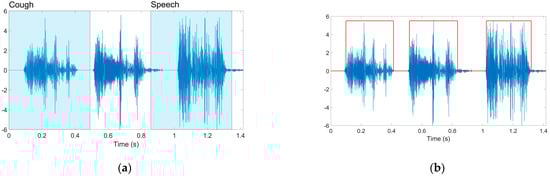 We considered two distinct options to identify the audio segments that do contain pure cough sounds. Following other studies, we first tested the efficiency of a YAMNet deep convolutional neural architecture pre-trained on the AudioSet-YouTube corpus to classify audio-type data into 521 different classes (including the “Cough” class) [21,22]. However, experiments using the pre-trained model available in MATLAB 2022a revealed inconsistent conclusions, often interpreting actual cough segments as “Throat clearing” or even “Speech”. As such, we switched to the method introduced in [23] that uses a digital hysteresis for selecting regions exhibiting rapid signal power variations specific to cough samples. The solution additionally enables the assessment of the audio quality by computing the ratio between the signal powers in the cough regions and the rest of the recordings, respectively (comparing this against a user-defined threshold value permits the selection of only reliable, consistent audio samples). As such, we selected only audio samples for which the previously defined signal-to-noise ratio exceeded 10 dB. Figure 2 presents a segmentation and labeling example.