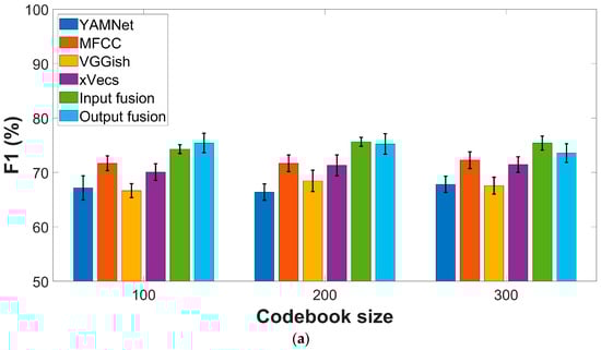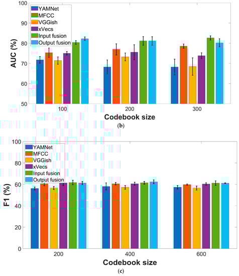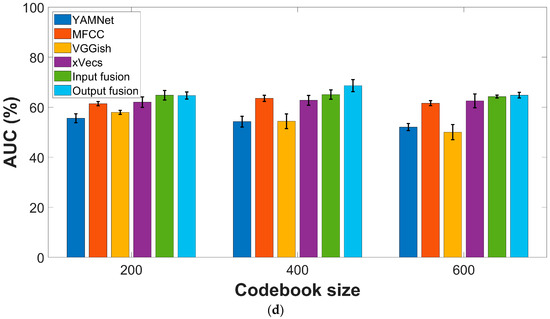 Comparing the results presented in Table 1 and Figure 3, Figure 4 and Figure 5 with references that consider hand-crafted features extracted from the audio recordings or similar types of features derived from CNN models [32,34,35] typically combined with SVM classifiers, we may conclude that the BoW model offers comparable or better performances in terms of F1-score and AUC values. As such, for the COUGHVID dataset, AUC values typically less than 65% are obtained. For the COVID-19 Sounds dataset, the previous references report AUC values in the 62–66% range, with only the OpenL3 + SVM model reaching 70% [38]. On the other hand, significantly better results are obtained using more sophisticated classifier models such as the Bayesian Neural Network or the Self-Supervised Audio Spectrogram Transformer [39]. Nevertheless, the same study reveals no improvement over performances based solely on user-reported symptoms, hence calling for a careful analysis of various confounders in AI-based diagnostic tools.
